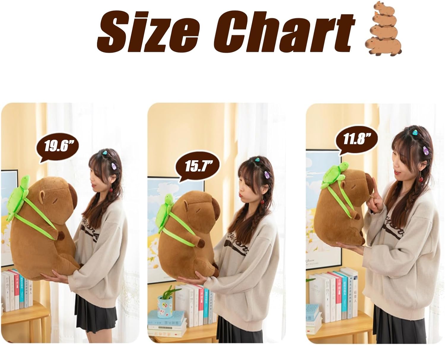 The three available sizes of the plush capybara animal toy (Small 30cm, Medium 40cm, and Large 50cm) allow it to be utilized for a variety of purposes, including napping, back-resting, lumbar, and home decoration.