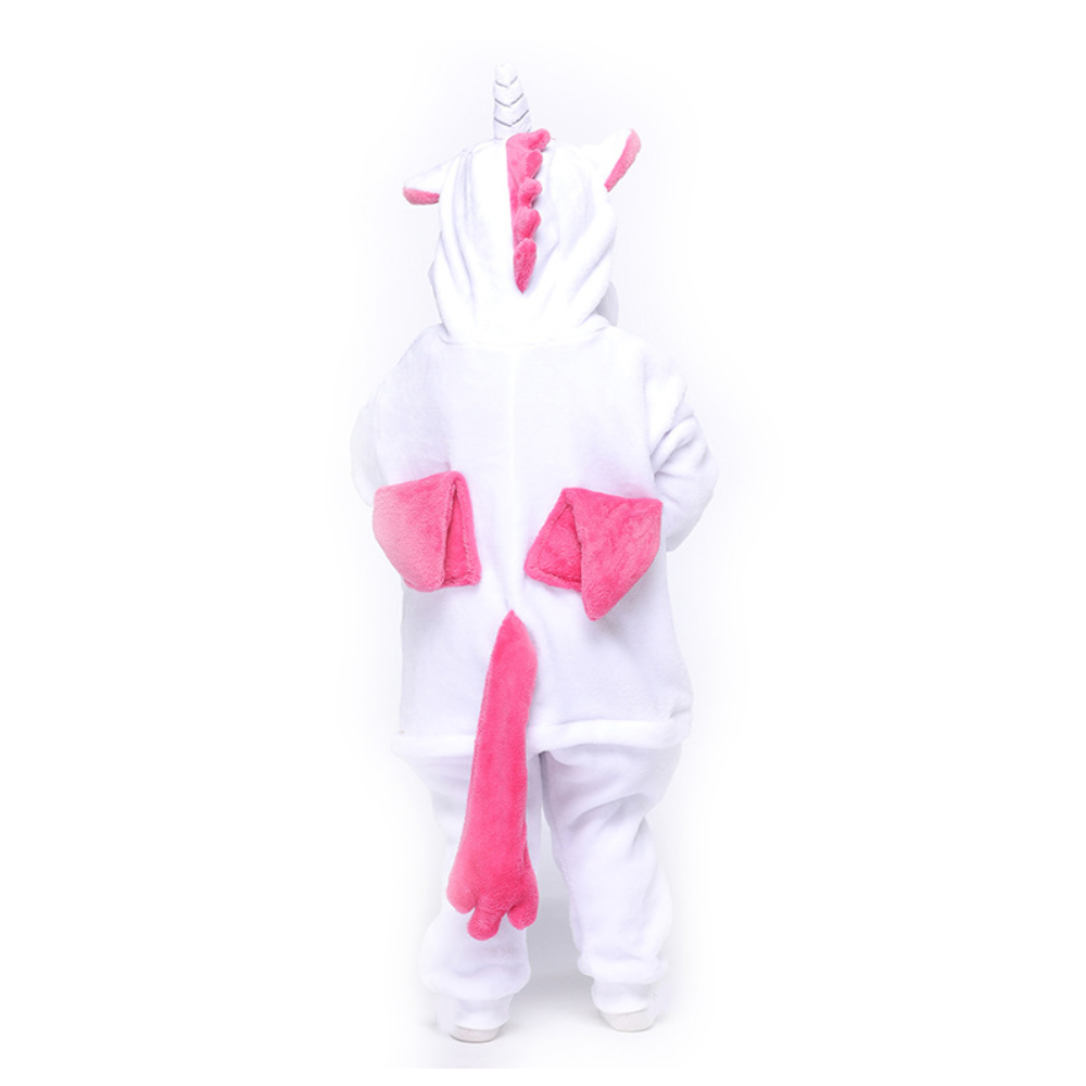 Each onesie features a light purple bodysuit with a pair of pink wings at the back and a pink tail just below them. The pink underbelly also features a full front button closure, and these onesies have lots of pockets: one on each side, and another at the back which you can close with a zipper. Your child will undoubtedly be the cutest unicorn anyone will see when they slip on the hoodie that features a unicorn's face, ears, and a horn. Give your child a magical time with our onesies!