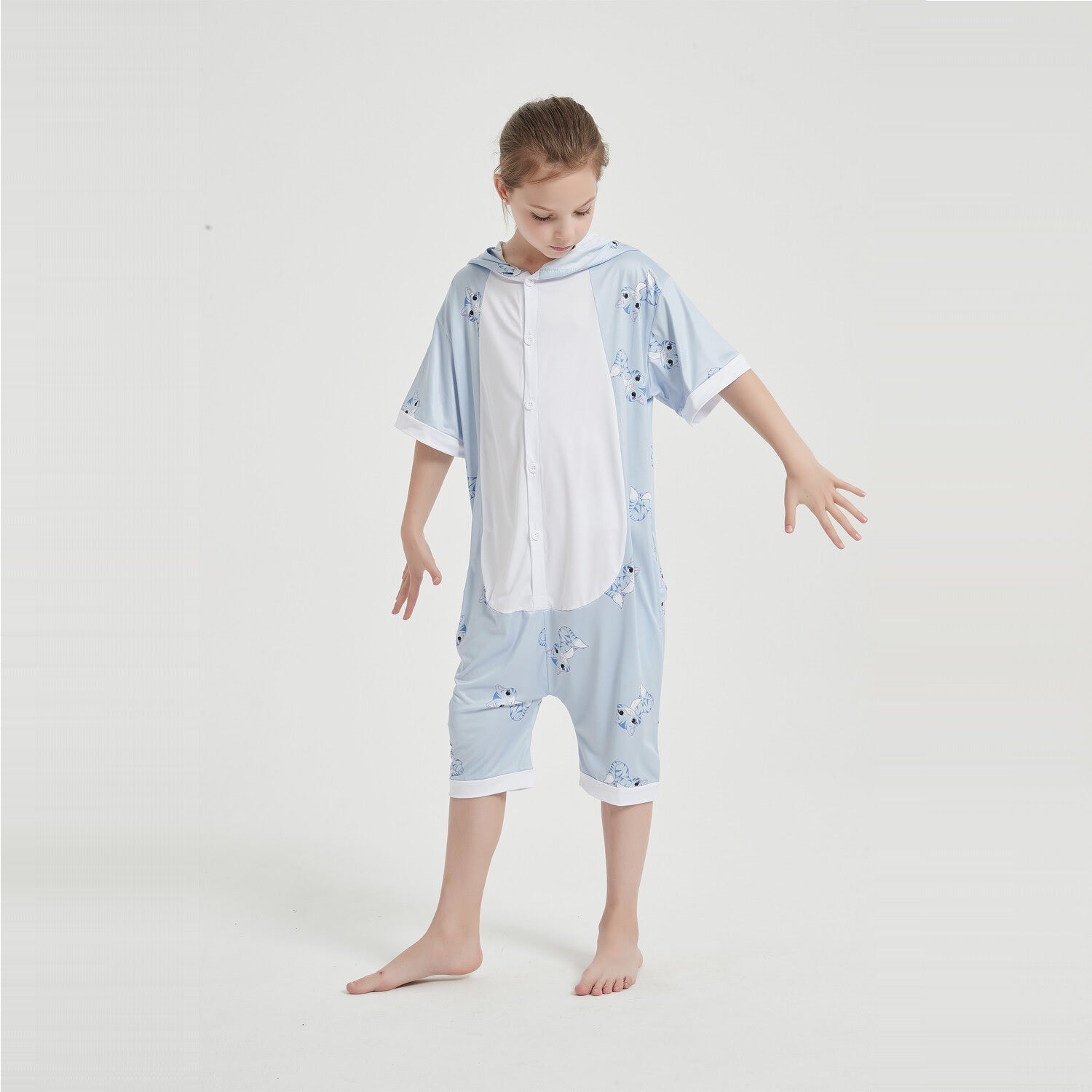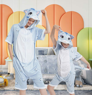 This is a small white and grey kitten with large black eyes. She is very easily distracted and does not have much experience of the world. You can find all kinds of cat trait here: lazy lifestyle and love of fish biscuits. You know what they say about cats, but you will have ALL the luck when you wear this Summer Onesie!