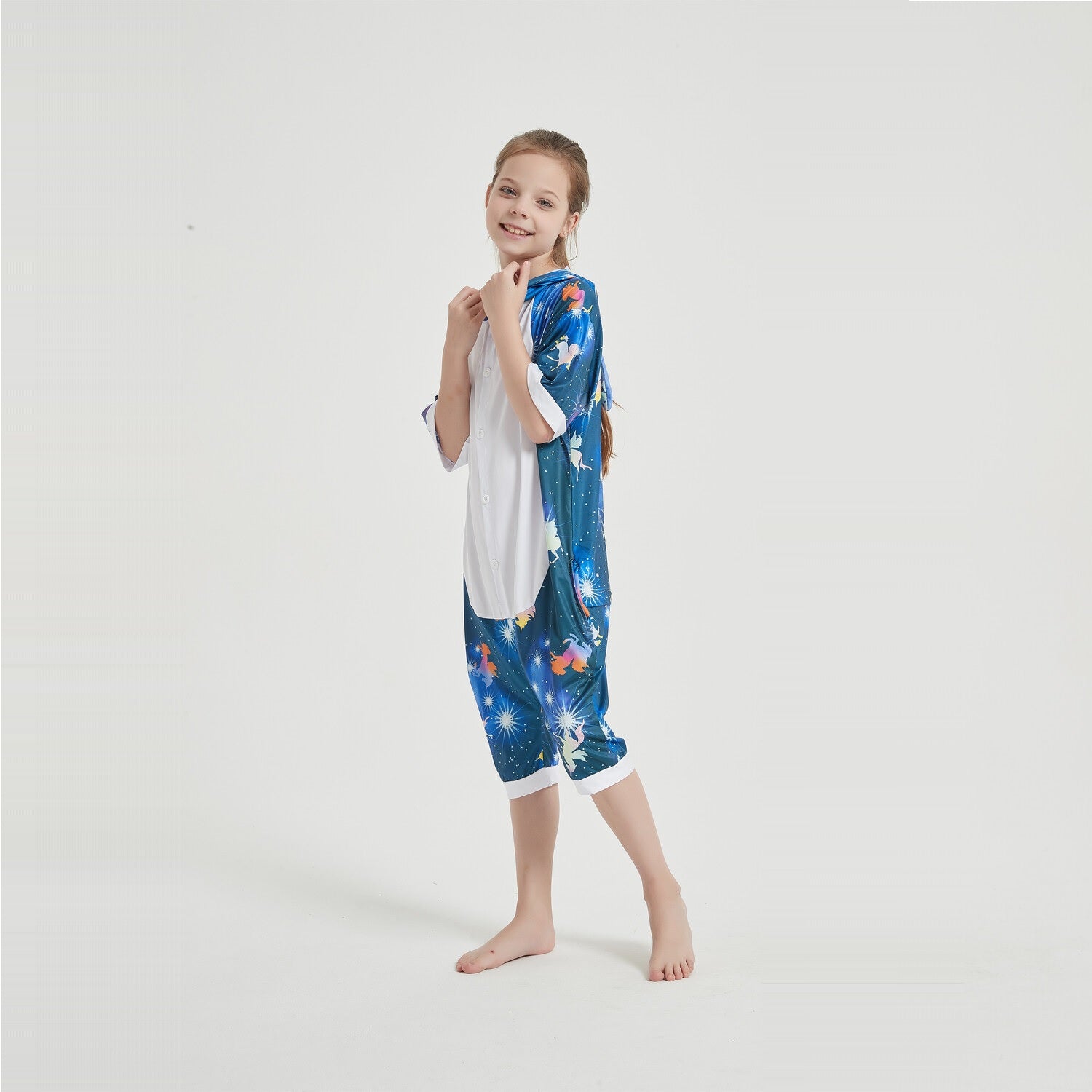 This Dark Galaxy Unicorn Onesie comes in a diagonal stripe pattern in dark blue, black, white and purple. White stars accent the stripes to give the pattern a mystical look. The hood comes with a matching horn, ears, and face.