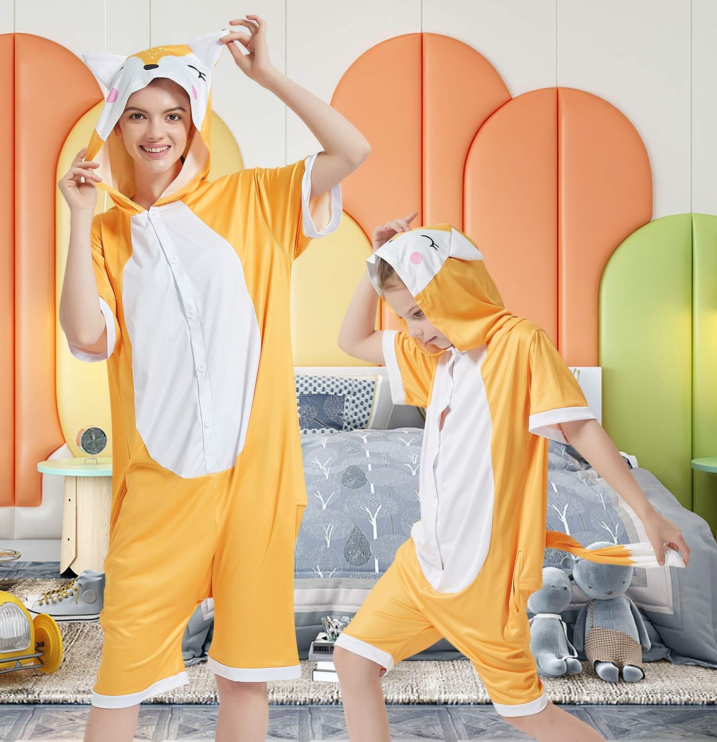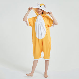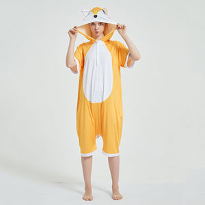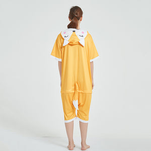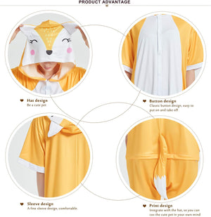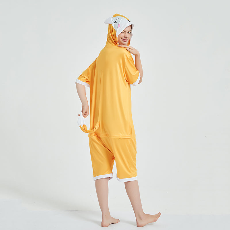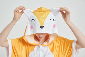 “What does the fox say…?“ Do you want to join in on the foxy fever? Get into it by wearing our adult summer onesies. These yellow-orange short onesies have hoods that have sweet eyes, a dotted face and rosy cheeks. The back has an orange and white tail.