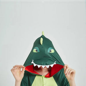 This suit features a yellow belly patch and matching snout and spikes on the hood. A sweet tail completes the look. The dinosaur spikes line the back from the top of the hood all the way to the tip of the tail, so that you can be the best dinosaur.