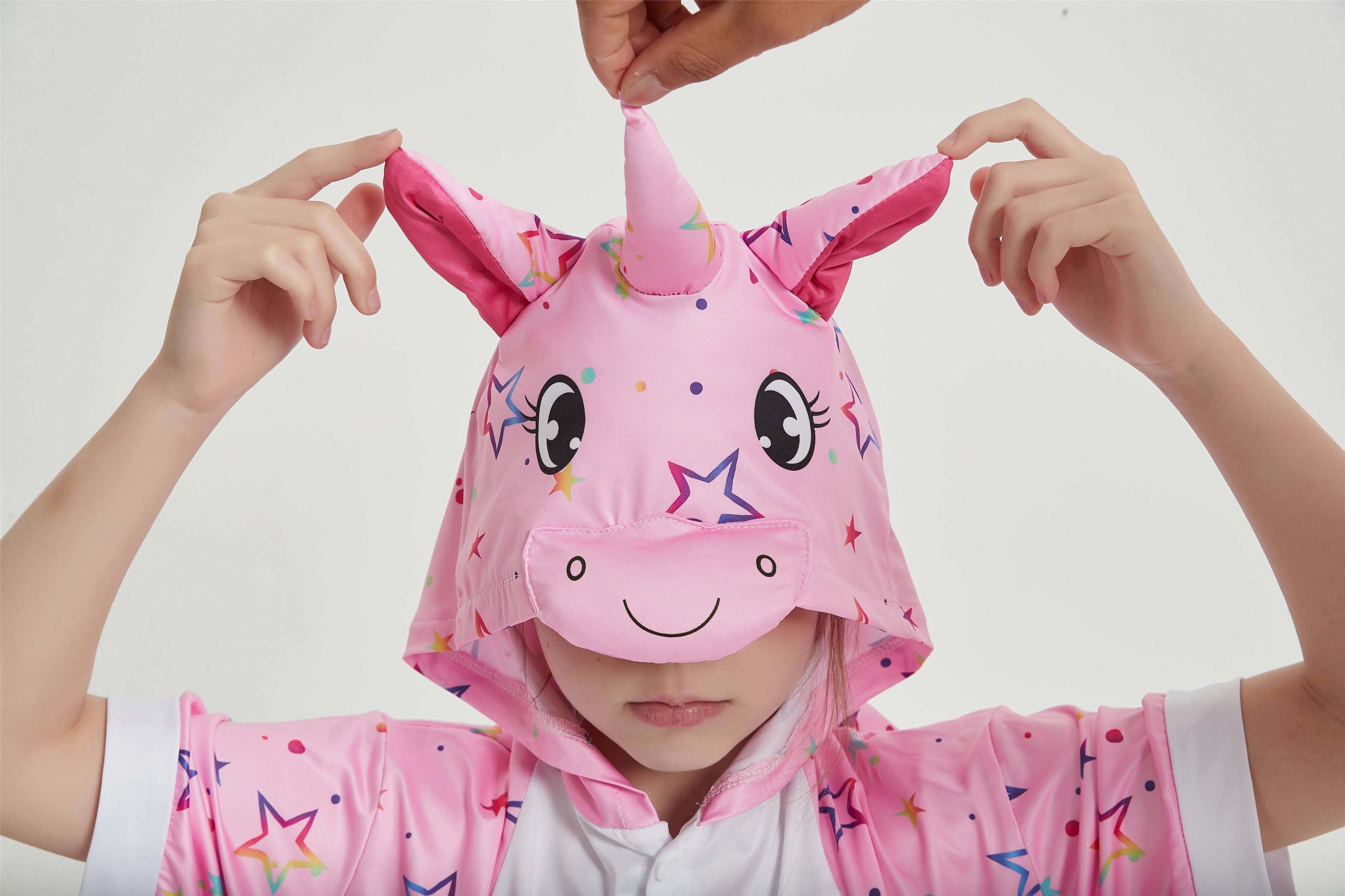 It comes with an all-over pink pattern that features colored splotches that are highlighted with white stars. The hood offers fun elements, such as ears, a mane and a colorful horn that matches the rest of the outfit.
