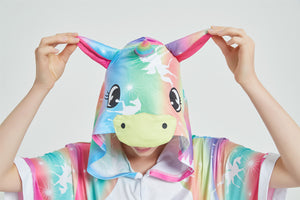 Unicorns are magical creatures and now you can have magical adventures in this soft, comfortable unicorn onesie. This unicorn onesie costume is in a colourful colour and a white stomach. The hood of this summer onesie features a unicorn face with pink ears, a pink mane and a yellow horn. It is the perfect costume for Halloween, dress-up, ComicCon, cosplay, parties or special events.