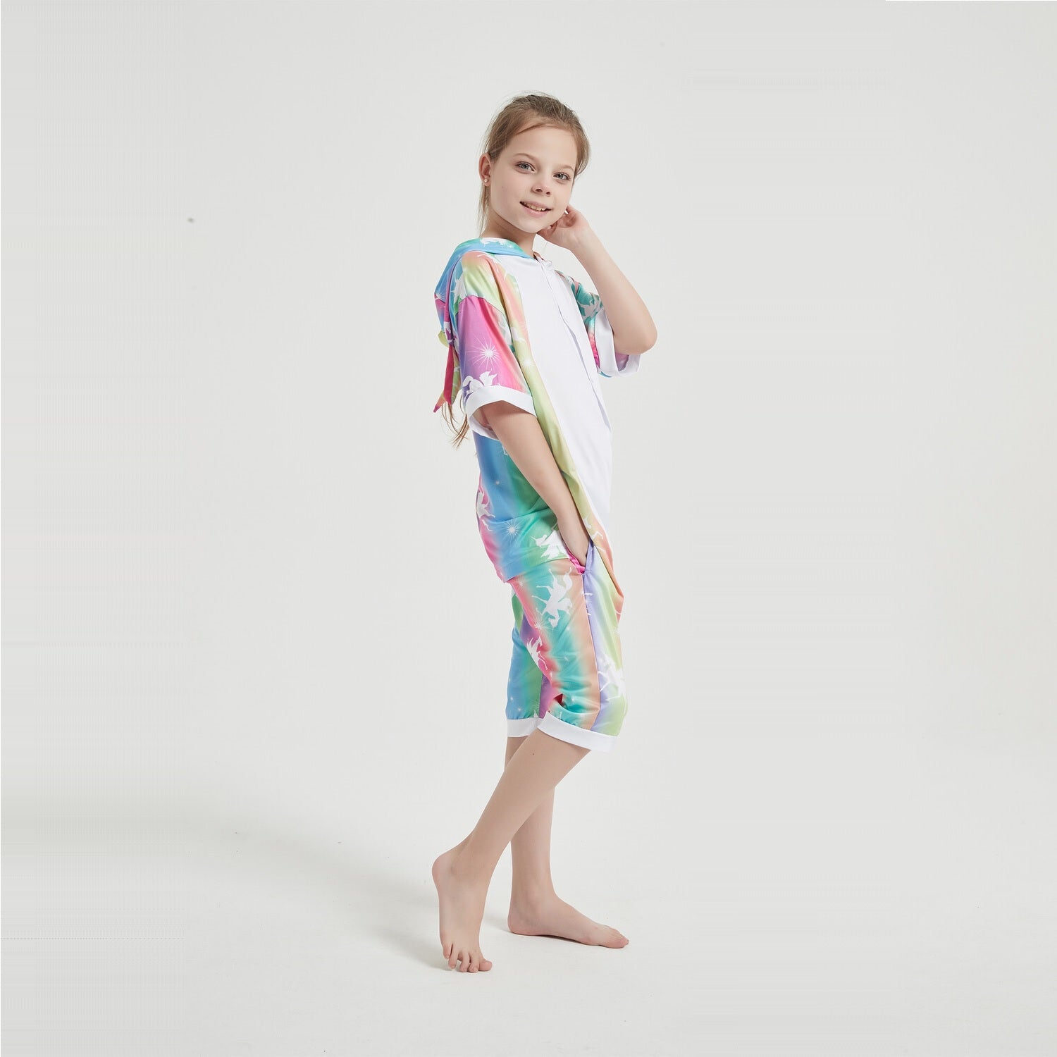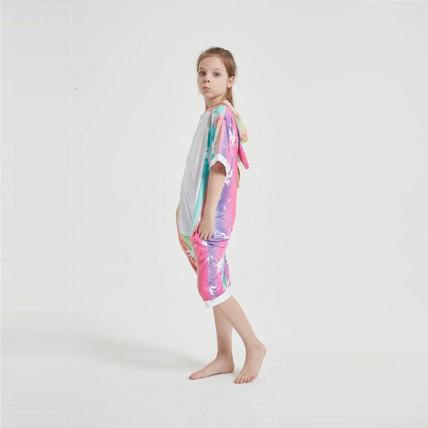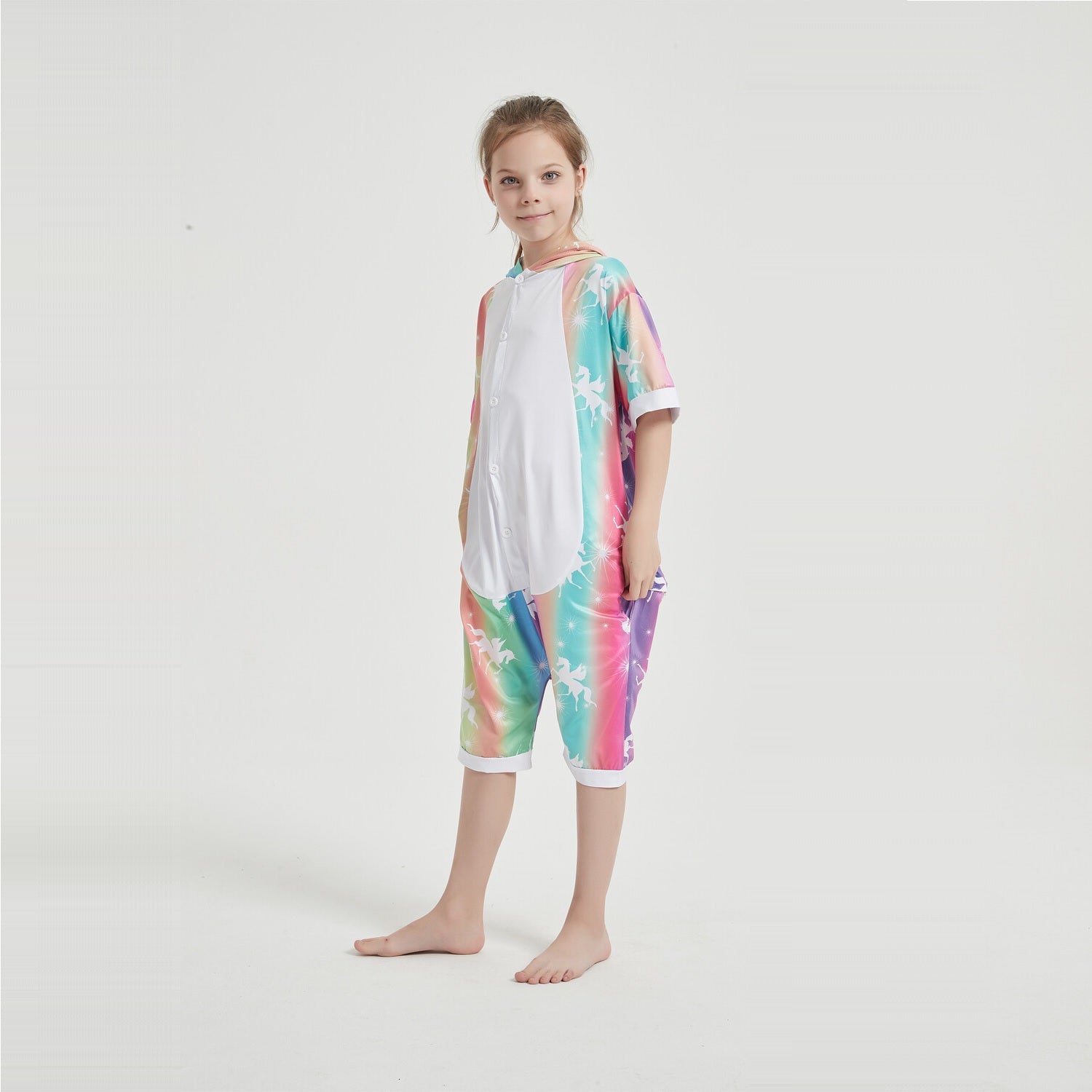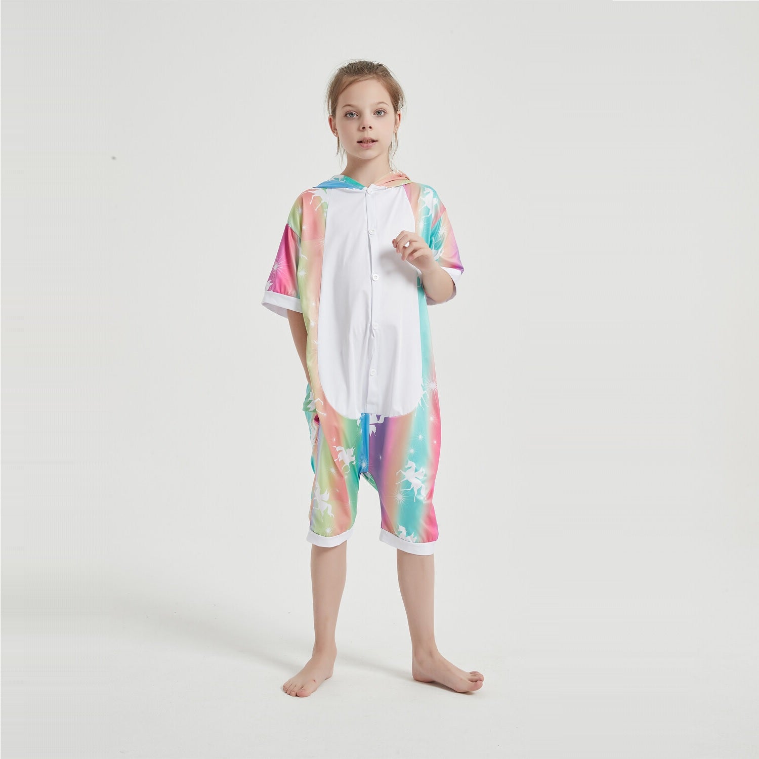 Unicorns are magical creatures and now you can have magical adventures in this soft, comfortable unicorn onesie. This unicorn onesie costume is in a colourful colour and a white stomach. The hood of this summer onesie features a unicorn face with pink ears, a pink mane and a yellow horn. It is the perfect costume for Halloween, dress-up, ComicCon, cosplay, parties or special events.