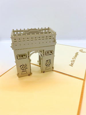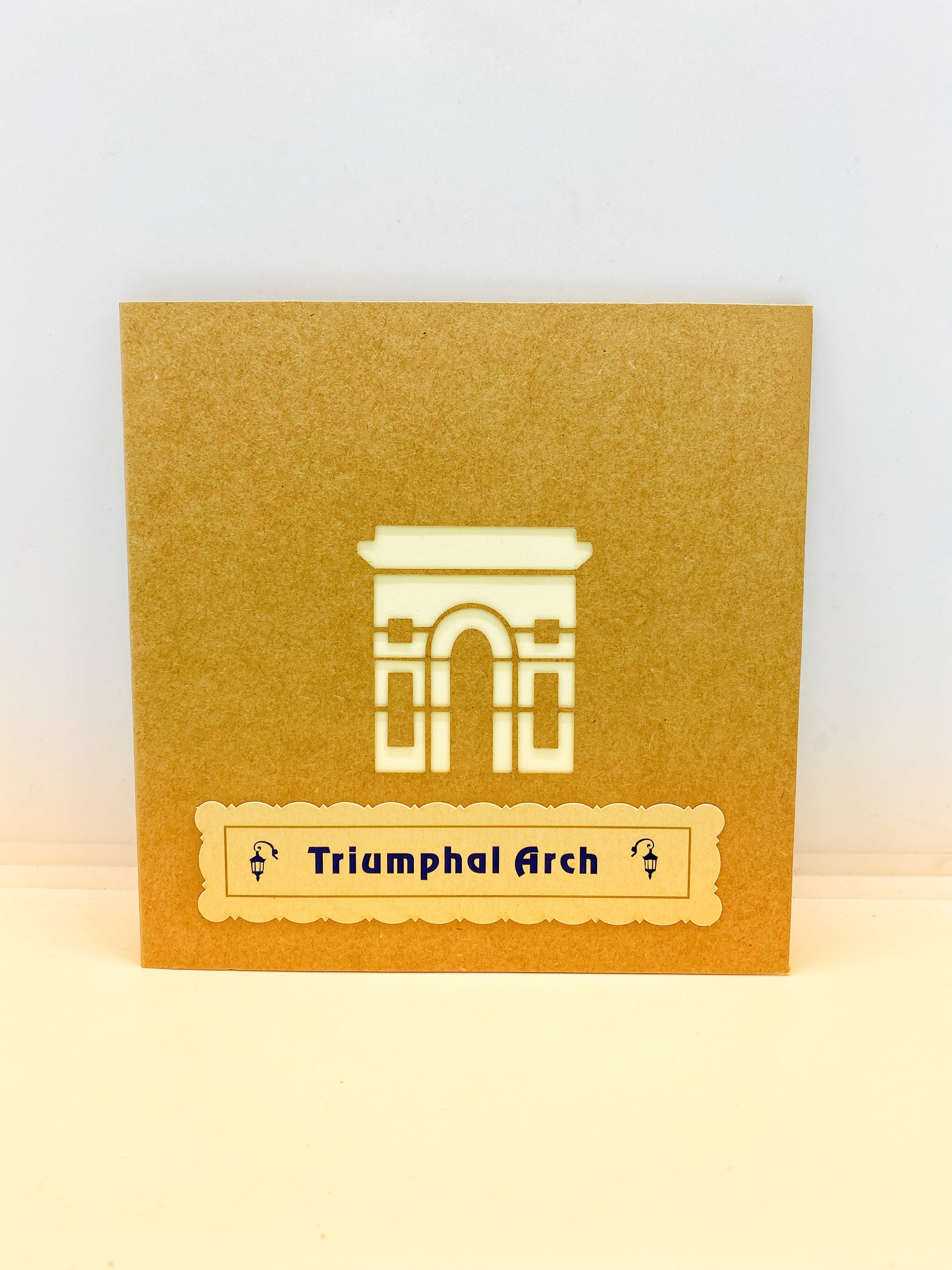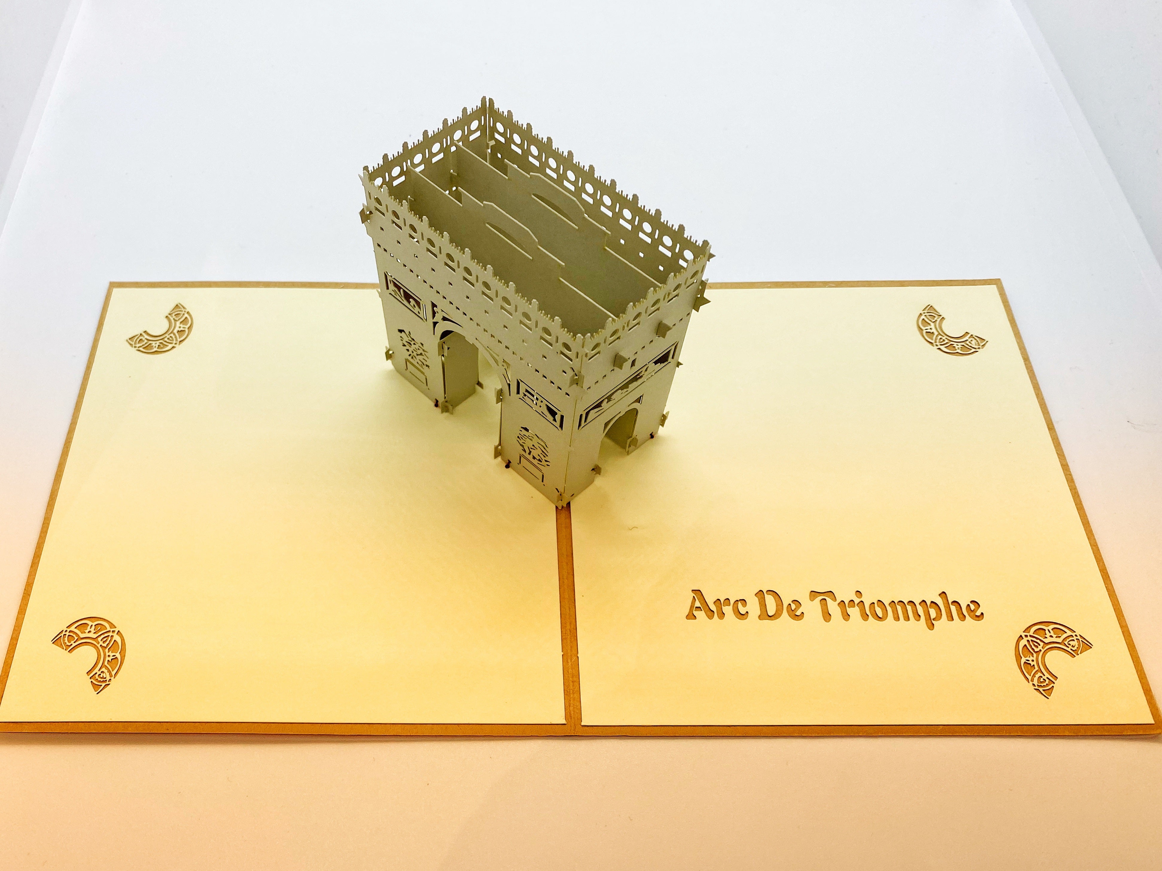 The card has a yellow gradient as the background, and on the lower part of the cover is a printed pattern of the Arc de Triomphe in Paris, with “Triumphal Arch” written under it. The inner page of the card is light cream and in the middle of the inner page is a 3D laser triumphal arch. It is assembled from six flat laser patterns.