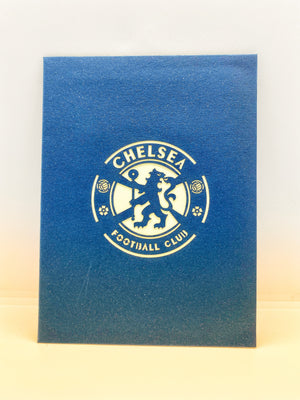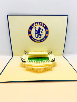 Chelsea 3D stadium pop up greeting/gift card displaying. The card opens up to display a model of the Stamford Bridge stadium in the form of a magnificent 3D pop up card model.