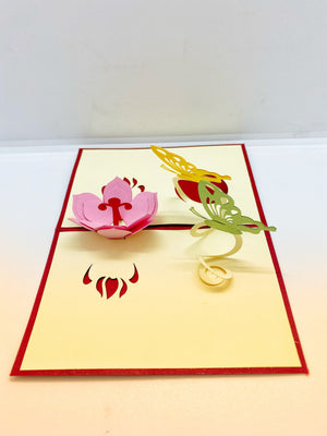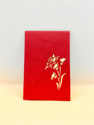 This pop up features a red cover laser-cut with few flowers on the corner of the card.