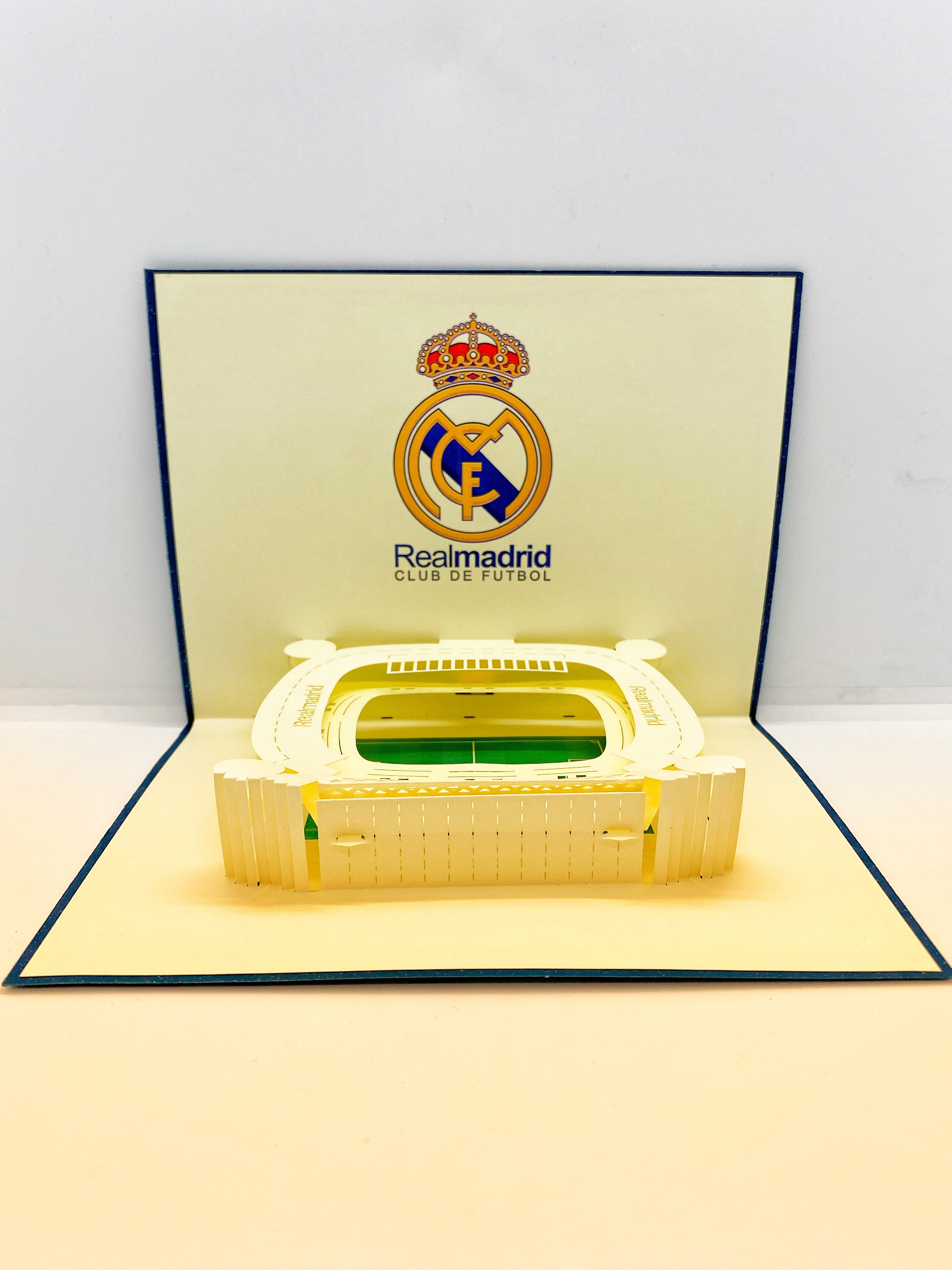 Real Madrid 3D stadium pop up greeting/gift card displaying. The card opens up to display a model of the Santiago Bernabéu Stadium in the form of a magnificent 3D pop up card model.