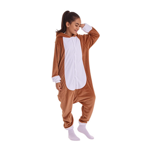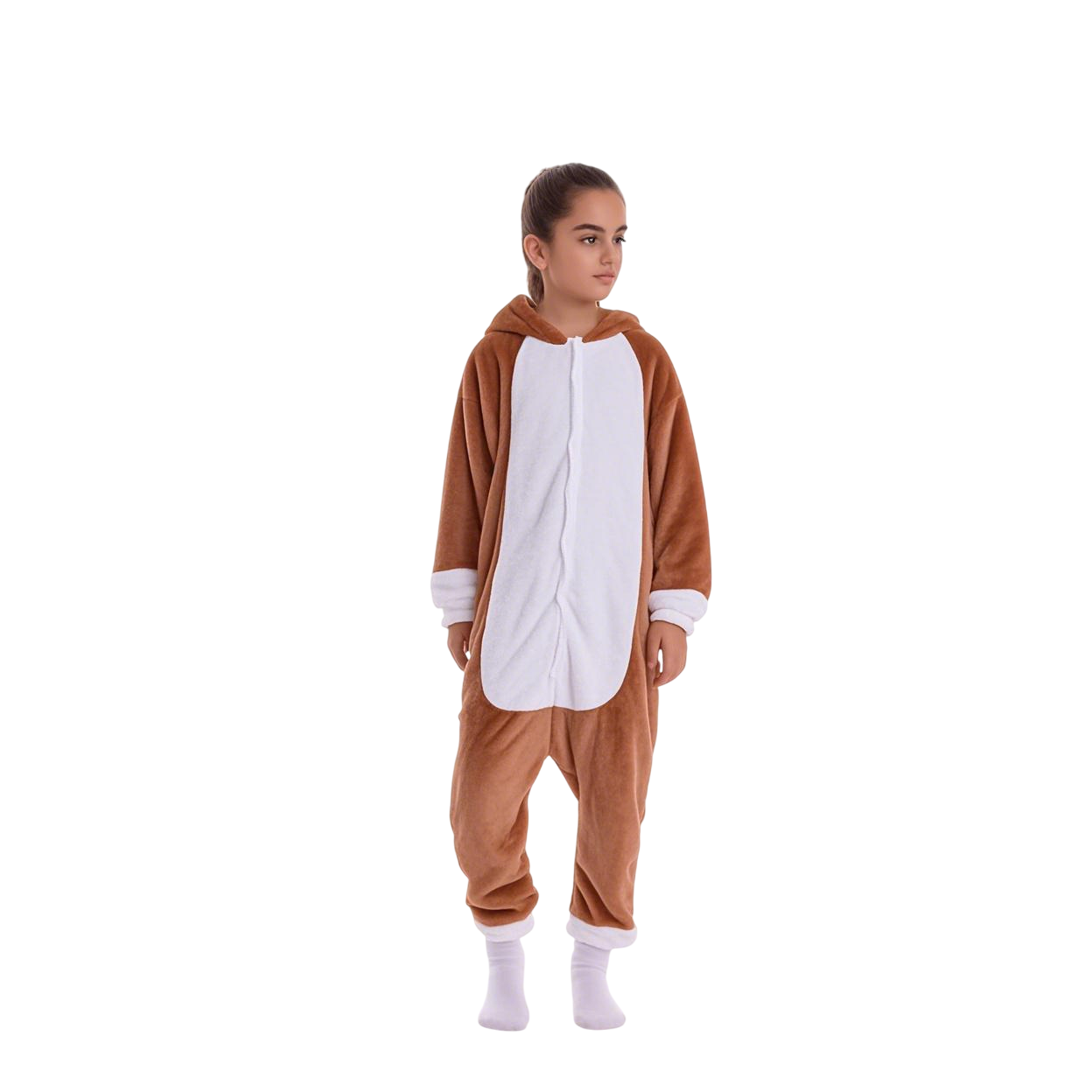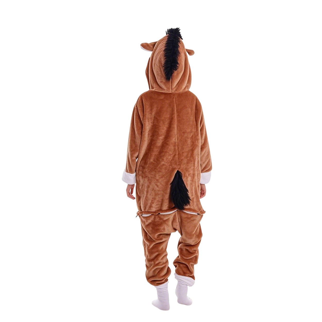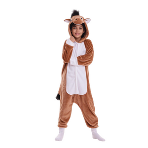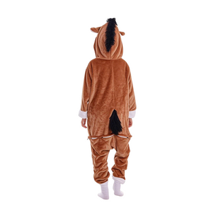 They're baggy and lightweight with elastic wrist and ankle cuffs, making them very comfortable to wear and suitable for active kids. The hood features a cute horse face with embroidered eyes, flaring nostrils, ears, and a mane of black fabric or faux fur sticking up. There is a black tail attached at the back, adding to the horse theme.